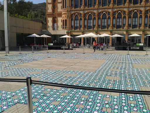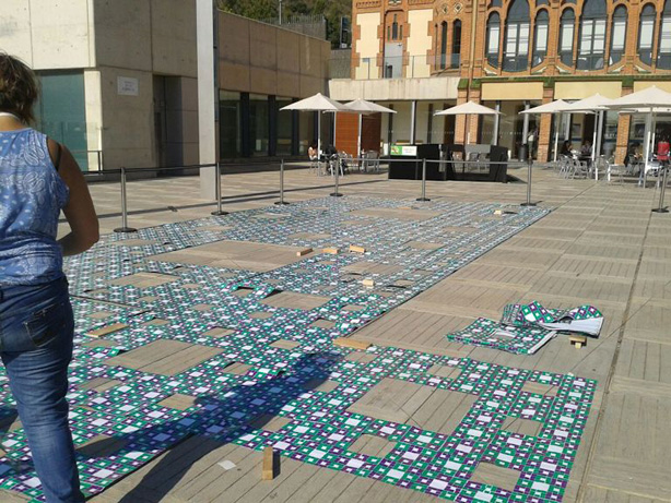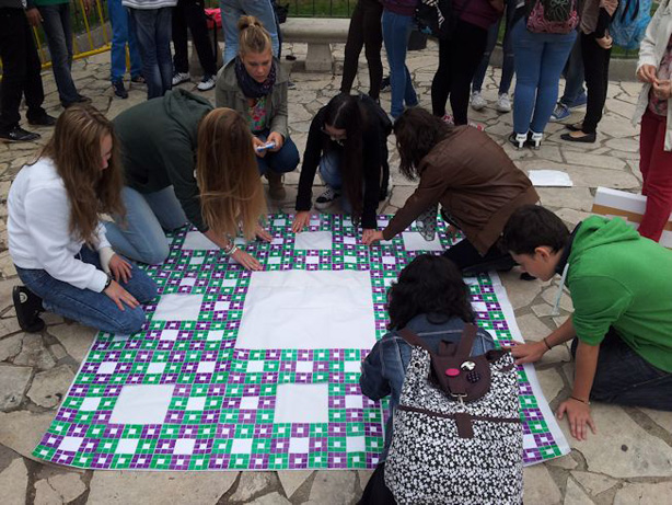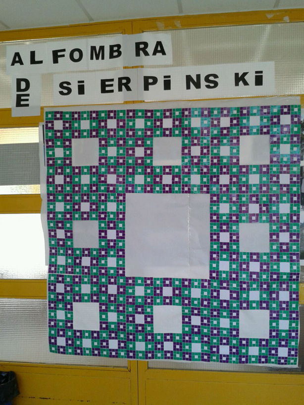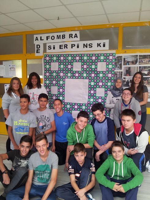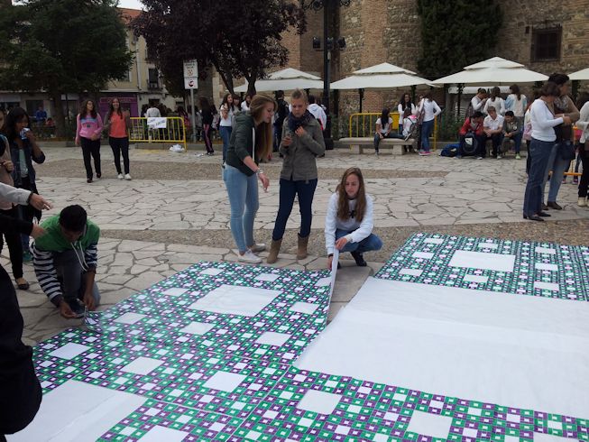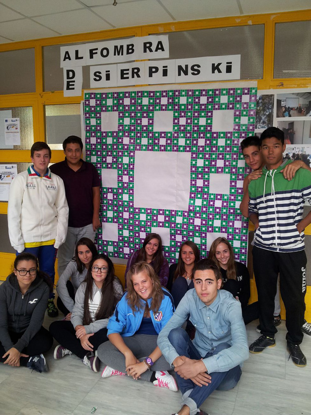 Los alumnos de 2º F y 3º D construyeron la cuarta iteración de la “Alfombra de Sierpinski”, que se expuso en el vestíbulo del centro durante varios días. La quinta iteración, moderada por el IES Juan de Padilla, se elaboró el 29 de Septiembre en la Plaza de los Leones de Illescas. Cooperamos un total de nueve centros de la provincia de Toledo. Unos días más tarde, el 3 de Octubre, se montó la sexta iteración en Cosmocaixa de Barcelona. Con ella concurrimos al ya mencionado proyecto “Juegos y Joyas Fractales“. Nos satisface transmitir a la comunidad educativa que los 64 centros implicados hemos recibido el primer premio de Matemáticas en el concurso Ciencia en Acción.