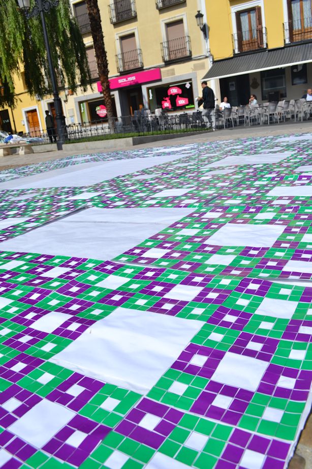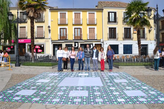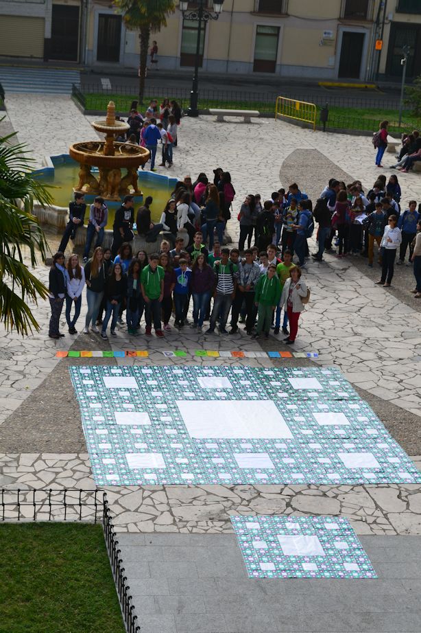 Los alumnos de 2º F y 3º D construyeron la cuarta iteración de la “Alfombra de Sierpinski”, que se expuso en el vestíbulo del centro durante varios días. La quinta iteración, moderada por el IES Juan de Padilla, se elaboró el 29 de Septiembre en la Plaza de los Leones de Illescas. Cooperamos un total de nueve centros de la provincia de Toledo. Unos días más tarde, el 3 de Octubre, se montó la sexta iteración en Cosmocaixa de Barcelona. Con ella concurrimos al ya mencionado proyecto “Juegos y Joyas Fractales“. Nos satisface transmitir a la comunidad educativa que los 64 centros implicados hemos recibido el primer premio de Matemáticas en el concurso Ciencia en Acción.