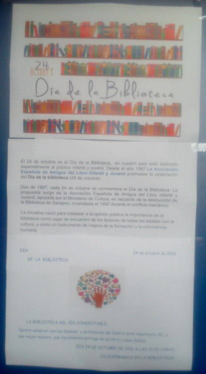 Con motivo del Día de la Biblioteca, el pasado lunes 24 de octubre, la biblioteca del centro organizó una actividad que consistía en hacer entrega de un libro y unos dulces a todos los alumnos y profesores que nos visitaran.