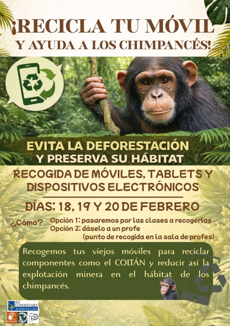 Los alumnos de 1º de Bachillerato (1CTA/B) de la asignatura de Biología, Geología y Ciencias Ambientales han presentado una exposición titulada “El Legado de Jane Goodall”. En ella, analizan los graves problemas ambientales, políticos y económicos derivados de la extracción de minerales como el coltán en el Congo, vinculándolos con la pérdida de biodiversidad y la explotación humana.