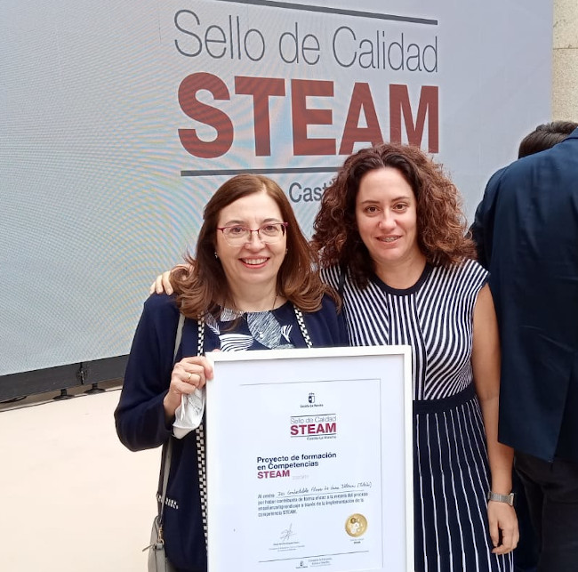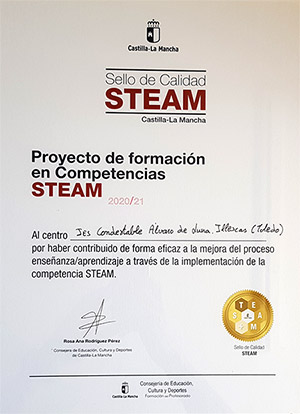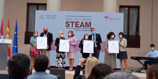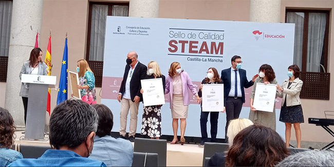 Hoy hemos recibido de la mano de la Consejera de Educación, Cultura y Deportes, Rosa Ana Rodríguez, el Sello de Calidad STEAM. Este premio ha sido otorgado a 46 centros de Castilla la Mancha, como premio al esfuerzo realizado en introducir esta metodología en sus centros y tras un proceso de autoevaluación para impulsar la mejora continua.