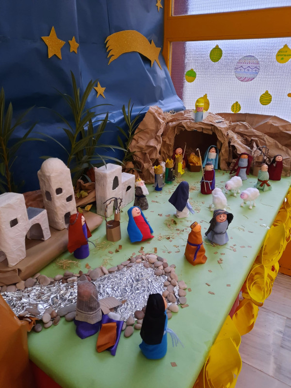 Para festejar la Navidad se ha realizado un belén con materiales reciclados al que han contribuido alumnos, padres y profesores y también, los alumnos de Comercio han aportado sus fantásticas decoraciones para crear el ambiente navideño.