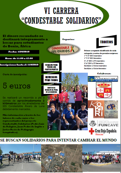 El próximo viernes 12 de abril tendrá lugar la VI Carrera solidaria que organiza el grupo “Condestable Solidarios” de nuestro centro. Todo lo recaudado se destinará a becas de educación para chicos y chicas de Benín, África, a través de la Fundación Kokari para el desarrollo del África occidental. Bajo el lema se buscan solidarios para intentar cambiar el mundo, animamos a la participación de toda la comunidad educativa para convertir nuestro instituto en un referente solidario de la zona. El evento comprenderá premios para todos, sorteo de regalos, trofeos, refrescos y buen ambiente.